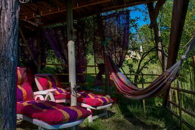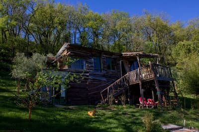 Programme : Quitter son lit après une bonne nuit de sommeil, préparer son petit-déjeuner en toute tranquillité et s’installer en terrasse avec une vue imprenable sur les alentours… voilà comment débute la journée chez Layénie sous les étoiles. À Bajamont, dans le Lot-et-Garonne, ce petit paradis est né de l’imagination de Frédéric Besnardière. En quelques années, le propriétaire de cette jolie adresse a retapé une ancienne ferme et a créé deux hébergements pour passer des nuits insolites. Sur ce domaine, la nature est reine, d’ailleurs on ne voit qu’elle quand on regarde par les fenêtres de la cabane en bois ou celles de la chambre d’hôtes. Layénie sous les étoiles surplombe le lac de Bajamont et offre un panorama sur les collines situées aux alentours. Sur place, les familles adoreront être en autonomie totale lors d’un séjour dans la cabane en bois. Les couples quant à eux apprécieront les instants de relaxation dans la baignoire balnéo ou le sauna présent dans la chambre. Les deux hébergements sont colorés et mettent bien en valeur les talents bricoleurs et artistiques de Frédéric. Tout est fait ici pour passer à la fois du bon temps à l’intérieur mais aussi à l’extérieur. Suivi de près par les moutons, vous pourrez leur fausser compagnie en profitant des eaux de la piscine hors sol du domaine. Ensuite les possibilités de sorties dans le coin sont nombreuses. Frédéric pourra même vous prêter des vélos, le bon plan pour découvrir les environs d’Agen en mode slow.