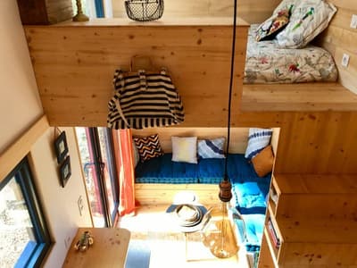 On vous a trouvé une excellente raison de foncer, cheveux au vent et valises au poing, vers le Maine-et-Loire, et plus exactement vers la charmante bourgade Clefs Val de Loire. Découvrir le zoo de la Flêche, pêcher la truite au Moulin Hubeau ou visiter le château de Baugé, dans les environs, sont déjà en soi de très très bonnes raisons d’y aller. Mais si en plus vous faites étape au Tiny Stay Ecolodge, c'est la totale! Ce petit paradis à 39 km d'Angers abrite au milieu des pins et des fougères quatre tiny houses. Comme leur nom l'indique, ces maisons sont minuscules. Aux Etats-Unis, où elles se sont développées depuis la crise financière de 2008, les tiny houses peuvent même se déplacer d'une région à l'autre, car montées sur roues; elles ont surtout convaincu les amateurs de modes de vie alternatifs comme Mathieu Ricevuto, le propriétaire du site, séduit par leur minimalisme. Mais attention, ces mini-maisons très fonctionnelles ont tout de grandes: on y a fait rentrer au chausse-pied 4 couchages, une douche, un salon, et tout ce qui garantit le confort, de la bouilloire aux petits bibelots bien alignés sur les étagères. De vrais petits nids, tout de bois habillés. Les enfants adoreront rejoindre leur lit sur la mezzanine. Ou prendre leur petit déjeuner sur un étonnant mobilier de jardin: quatre souches en guise de sièges et un couvercle de tonneau pour plateau de table ! Bref, rusticité et élégance se conjuguent à merveille dans cet écolodge. Peu d'activités et d'animations au programme mais c'est pour mieux profiter d'une ennivrante sensation de liberté.