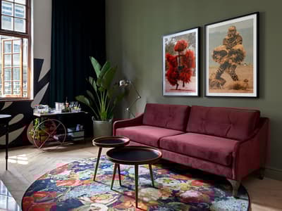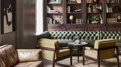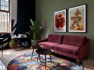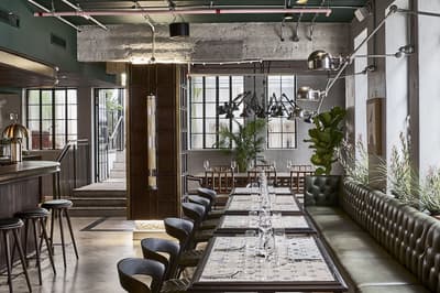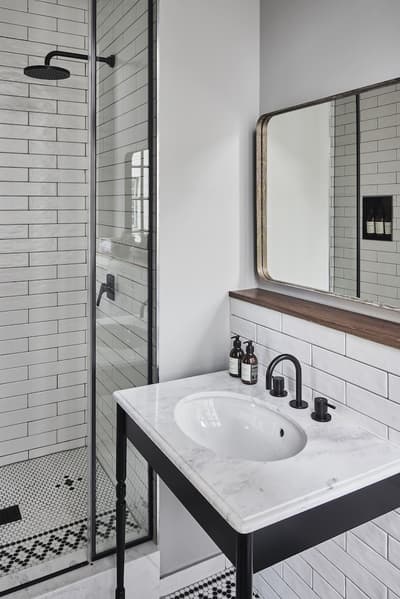 Dans un style de décoration contemporaine, il comporte un beau parquet, un mobilier confortable et se complète par des plantes intérieures. Elle comprend deux salles de bains privatives ; l'une avec des toilettes fermées séparées, une baignoire et une douche autoportantes et l'autre avec une grande douche à effet pluie à l'italienne vitrée et des toilettes, toutes deux terminées avec un lavabo unique sur des pieds tournés à la main Gregor Jenkin conçus sur mesure avec un sol en carreaux de penny partout.