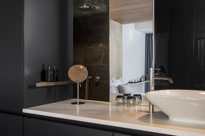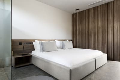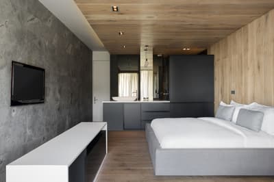 Elle bénéficie d’une décoration contemporaine et luxueuse et comporte un beau carrelage de qualité, un mobilier high-tech et se complète harmonieusement dans des tons froids. La chambre est dotée d’un lit king size et la salle de bains attenante décloisonnée est équipée d’une douche à l'italienne à effet pluie. Le tout dans une ambiance cosy !