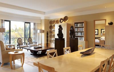 Décoré dans un style africain contemporain, le décor intègre des textures naturelles telles que des revêtements en pierre et des bois clairs et foncés; sculptures, peintures et autres pièces célèbres de la collection d'art saxon bordent les murs et les alcôves. La chambre est dotée d’un lit king-size habillé des meilleurs draps du monde et la salle de bains séparée luxueusement aménagée dispose d'une baignoire autoportante, de deux lavabos et d'une douche à l'italienne revêtue de pierre. Le tout dans une atmosphère conviviale !