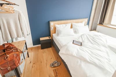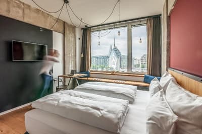 Imaginez-vous passer la nuit dans l’ancienne poste centrale de Leipzig ! Une véritable invitation à s’évader, pas vrai ? Le rêve devient réalité grâce au Felix Suiten am Augustusplatz, qui investit ce bâtiment industriel typique des années 1960 et du style après-guerre de l’ex-RDA. Très stylé et chargé d’histoire et de belles histoires couchées sur les millions de lettres qui ont transité par là. On kiffe ce genre de lieu chez Fairmoove, vous le savez ! Et quand en plus, ils sont full engagé niveau écologie, c’est encore mieux. Ici, pas de plastique à usage unique, de la food locale et bio, et des produits d’hygiène écolo. D’ailleurs, l'établissement a obtenu le label GreenSign. Côté atmosphère, ça joue à fond la carte du style indus, avec des touches pop et bohème, du béton brut et des coloris tendance. Pour un panorama de ouf sur toute la ville, prenez l’ascenseur direction le rooftop où l’on peut chiller, célébrer et savourer en amoureux ou entre potes. Enfin côté chambre, on adore les petits clin d'œil au passé, comme ces morceaux de murs laissés bruts. On kiffe aussi les larges baies vitrées (les ouvertures sont d'origine) qui plongent sur la ville de Leipzig.