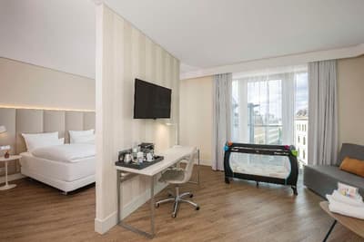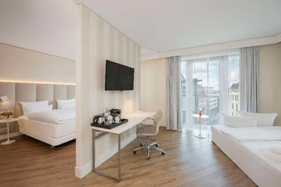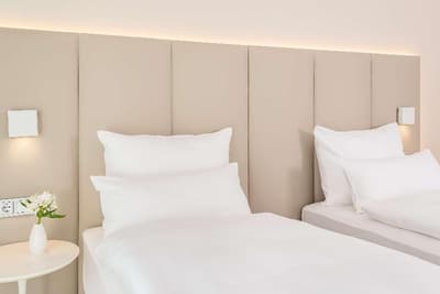 Si on vous dit violon, Toccata, fugue en ré mineur et Thomaskirche. Vous nous répondez Jean-Sébastien Bach, bien sûr ! Et c’est juste en face de la célèbre Thomaskirche, où le compositeur imagina ses plus belles œuvres, que nous vous proposons de passer la nuit ! Stylé, non ? Et si vous n’êtes pas fan de musique classique, rassurez-vous : Leipzig possède également une scène underground prolifique ! C’est même le nouveau Berlin selon certains. Alors forcément chez NH, on a mis les petits plats dans les grands en squattant un superbe immeuble contemporain, sorti de terre il y a moins de 10 ans. Le résultat : un hôtel très design avec de belles hauteurs sous plafond et de larges baies vitrées. Labellisé Bioscore, l'établissement est très engagé : réduction des émissions de CO2, approvisionnement local et responsable, réduction des déchets et recyclage. Dans les chambres, l’efficacité énergétique se combine à un design lui aussi efficace : sobriété, modernité, coloris tendance et intérieur lumineux. L’hôtel ne dispose pas de restaurant, mais propose un petit-déjeuner buffet à base de produits frais, ainsi qu’un bar lounge où faire de belles rencontres au retour d’un citytrip. Et pour les plus sportifs, une salle de sport est à disposition.