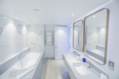 Style résolument minimaliste et moderne, elle comprend un fauteuil confortable avec une petite table pour prendre votre apéritif et des jumelles pour contempler la vue sur le port. La chambre est dotée d’un lit king-size et bénéficie d’une luminosité naturelle. La salle de bains est équipée d’une douche cascade ou d’une baignoire. Le tout dans une ambiance relaxante !