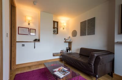 Petite, mais très confortable, elle a tout ce qu’il faut pour un séjour agréable. Elle accommode un grand lit et dispose de fauteuils dans un coin salon.. Salle de bain avec douche à effet de pluie.