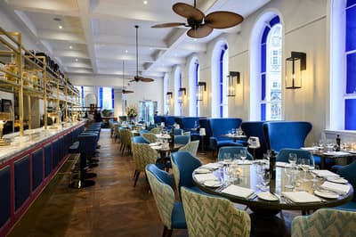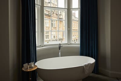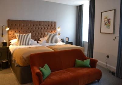 Impossible de faire plus central à Bristol ! Et plus historique… Le Bristol Harbour Hotel & Spa — au nom trompeur puisqu’il ne se situe pas du tout au bord de l’eau — a élu domicile dans un superbe bâtiment classé datant du 19e siècle. La salle des évènements n’est autre que le magnifique hall Sansovino, de l’ancienne banque Lloyds. Le spa, pourtant futuriste avec ses couleurs flashy, se situe dans la salle des coffres d’autrefois. D’où son ambiance tamisée ! Et dans les chambres, on retrouve le style chic et cosy de la chaîne Harbour. Têtes de lit matelassées, canap’ ou fauteuil comfy, moquette douce et tissus aux teintes toujours bien choisies : l’ensemble est super élégant. Les éléments d’époque s’intègrent avec brio à cette déco plutôt contemporaine. L’illustration parfaite, c’est la suite, où la baignoire îlot est installée face à la cheminée de pierre. Mais notre coup de cœur dans cet hôtel reste son bar hyper éclectique ! Une explosion de couleurs et de motifs, et des mix & match réussis qui mettent en valeur les ornements de ce sublime édifice. C’est notre endroit préf’, même si on aime aussi le restaurant tout en longueur. Un espace intime aux côtés de chaque fenêtre en arc : le top pour un repas en tête-à-tête ou pour se retrouver en famille.