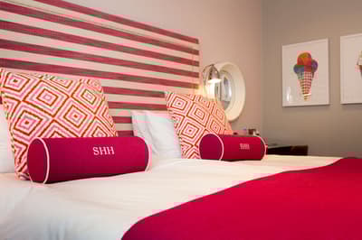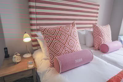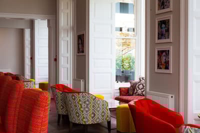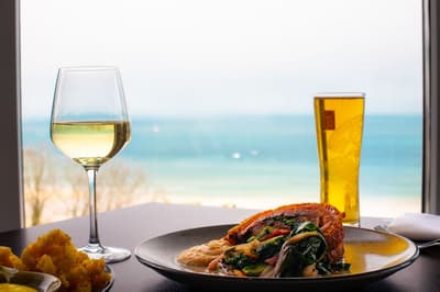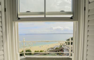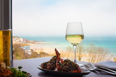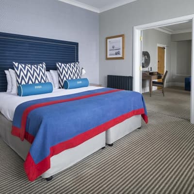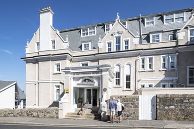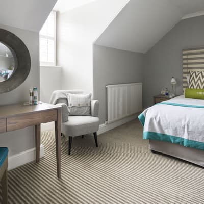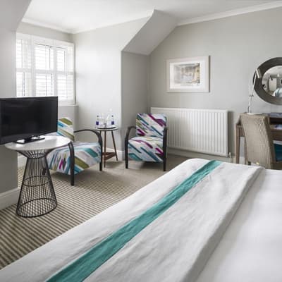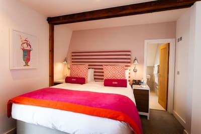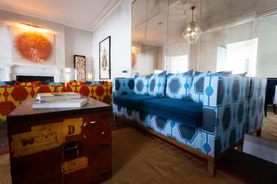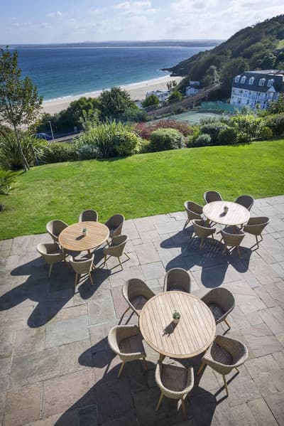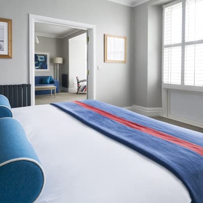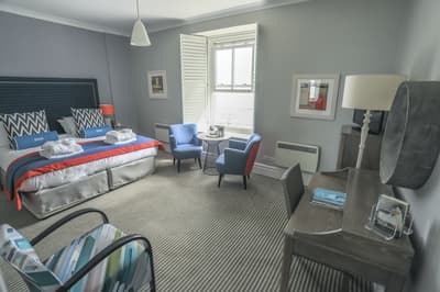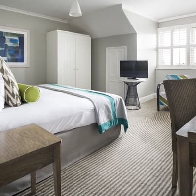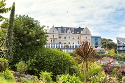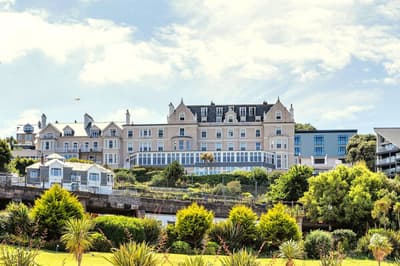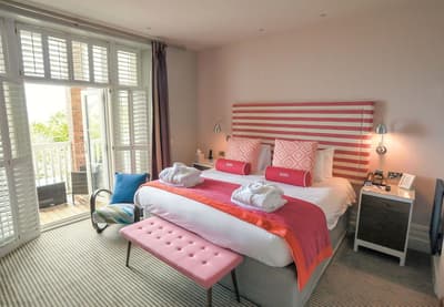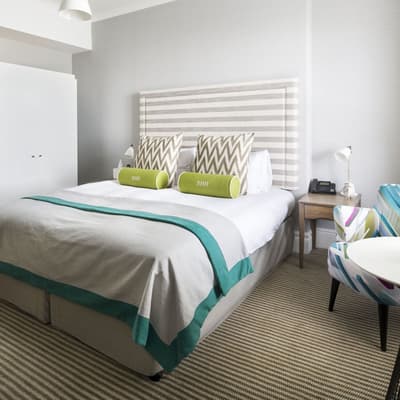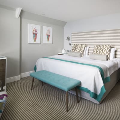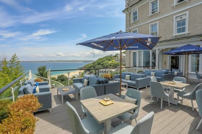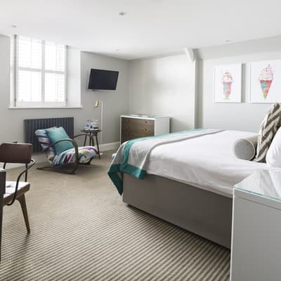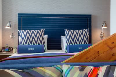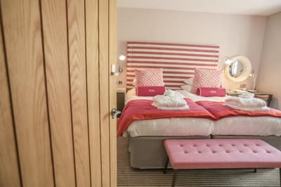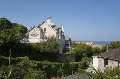 Dressé sur une colline verdoyante, ce superbe édifice victorien surplombe la plage de Porthminster dans les Cornouailles ! Le St Ives Harbour Hotel & Spa ne passe pas inaperçu avec sa façade crème, ses encadrements blancs et son toit orné de cheminées typiques. Une archi qui donne beaucoup de caractère et un côté quirky aux chambres. Poser ses valises ici, ça vous met tout de suite de bonne humeur. Les beach vibes sont à l’honneur entre les têtes de lit rayées, les dessins d’ice cream et les volets intérieurs tout de blanc vêtus. Gros coup de cœur pour les hébergements où le rose et le orange illuminent la déco. Les poutres brutes, discrètes ou délimitant la pièce, offrent encore plus de cachet à l’hôtel. De manière générale, les espaces sont loin d’être impersonnels. En témoigne le lounge, trop chouette et super cosy avec sa belle cheminée, ses canap’ de velours rouge, son tapis vert, ses tissus à motifs ultra-colorés, ses fauteuils en cuir chic… Sans oublier le bar avec un piano et un lustre effet filet trop tendance. C’est ici et au resto, d’ailleurs, qu’on en prend plein les yeux ! Trouvez une place derrière les baies vitrées et laissez la magie opérer. Et lors des journées pluvieuses, direction le spa avec sa piscine intérieure et son grand choix de massages !