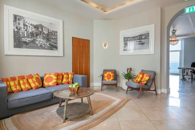 Cette belle chambre profite d’une vue merveilleuse sur la mer. L’atmosphère est sereine et reposante, idéale pour se détendre. Elle a tout ce qu’il faut pour un séjour des plus agréables et confortables. La pièce accueille un grand lit et dispose d’un beau fauteuil dans un coin de la pièce. Salle de bain avec douche à effet de pluie.