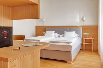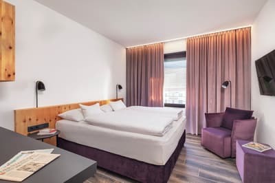 Ça vous dit de poser vos valises dans une institution d’Innsbruck ? Aisément reconnaissable à sa façade ocre et terre de Sienne haute de quatre étages, l’Hôtel Café Central est l’un des repaires du centre historique. Il faut dire qu’il est ouvert depuis… 1884 ! Ce n’est donc pas un hasard si on a l’impression de plonger dans le passé en découvrant le rez-de-chaussée avec ses lustres perlés, ses moulures au plafond et ses colonnes de marbre. Attention, l’endroit ne se veut pas guindé pour autant, la preuve avec les chambres sans chichis, à l'allure boisée réhaussée de jolies touches de couleur. En fait, l’esprit des lieux se veut résolument chaleureux : ça se sent ressent dans le service et aussi dans le café traditionnel viennois de l’hôtel (qui compte tout de même 22 cafés de spécialité), où tout le monde est bienvenu, touristes comme locaux. Super mélange de style, non ? Pour le petit déjeuner, vous aurez droit à un buffet fourni où les produits locaux sont de sortie. Vous aurez d’ailleurs également des cosmétiques 100 % naturels et locaux dans les salles de bains des chambres ! Eh oui, l’hôtel est membre de l’alliance climatique du Tyrol, une preuve concrète de son engagement en faveur de l’environnement. Peur de vous ennuyer ? Aucun souci là-dessus, car vous pourrez allègrement squatter l’espace bien-être du 4e étage avec son sauna finlandais et ses cabines infrarouges, galoper sur le tapis de musculation ou vous perdre à loisir dans les rues du centre-ville, en suivant les recommandations indiquées par l’hôtel pour ne pas en perdre une miette.