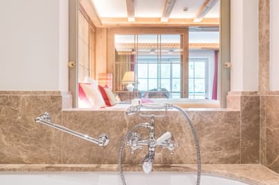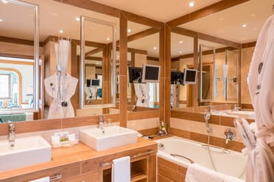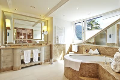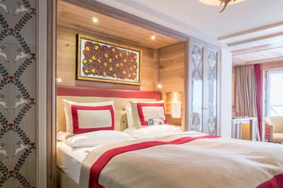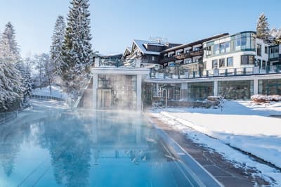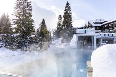 En 1929, une respectable Anglaise ouvrait un petit hôtel dans les Alpes tyroliennes... Rebaptisé Astoria en 1950, l’établissement a été constamment agrandi. Aujourd’hui, ce resort multirécompensé est devenue une référence. Un confort 5 étoiles décliné sur 20 000 m², un spa de 4 700 m², 5 piscines, un étang de baignade et une vue à tomber ! Voilà ce qui vous attend dans cet hôtel raffiné. Dès l’arrivée, vous êtes sous le charme. L’intérieur porte la patte du décorateur Pierre-Yves Rochon. Un mélange chaleureux de style alpin, meubles classic chic et matériaux luxueux. Tapis en peau de bête et bois de cerfs stylisés voisinent avec des canapés moelleux et des luminaires trendy. A l’image du lobby, carrément cosy avec ses moutons décoratifs et son immense cheminée. Juste à côté, le bar est hyper smart ! Tabourets rouges profilés autour du comptoir. Banquettes grises recouvertes de coussins écossais. Chintz sur les murs assorti à la couleur du plafond. Au restaurant Der Max, une toque au Gault & Millau, difficile de faire plus stylé. Chaises en lin crème capitonnées, suspensions noires à pampilles et éclairage sophistiqué. Mais la star de l’endroit, c’est bien évidemment le spa. Sublime avec ses salles de soins zen et épurées, ses piscines chauffées et son sauna avec vue sur les sommets. Côté activités, vous avez l’embarras du choix. Il y a même une cure de jeûne. Mais vu la qualité de la cuisine, réfléchissez quand même...