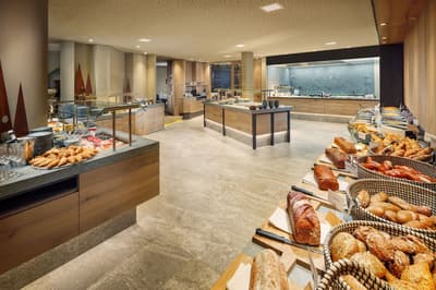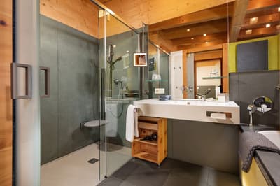 Toilettes GEBERIT séparées, Fontaine à eau de source, Bar à thé, Minibar, Café Nespresso machine.