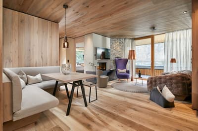 Cette magnifique suite profite d’un loggia plein sud avec mobilier de détente cosy dans lequel vous pourrez vous relaxer et contempler la vue imprenable sur la montagne. À noter qu’elle dispose d’un bureau, si vous devez travailler.