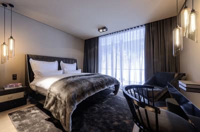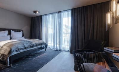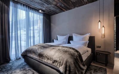 Zhero + Zhero = la tête à Toto. Ou plus sérieusement, 5 étoiles et 100% luxe ! Dans cet hôtel, il y a tout simplement des cheminées partout. Au bar-lounge, dans les Penthouses et même près de la piscine intérieure, vous retrouverez leur chaleur réconfortante à tout bout de champ. En plus de participer à l’ambiance sombre et intimiste de l’hôtel. Où que vous alliez, le combo murs noirs/lumières tamisées bleues et jaunes dans tout l’hôtel renforcera tout ça. Vous n’allez pas vous en plaindre ! Au contraire, ça contribue au côté luxueux. Tout est fait dans un mélange de bois, de briques et de verre. C’est presque aussi sublime que les luminaires suspendus ! Pour continuer sur ce chemin, vous aurez droit au grand luxe : un spa, un solarium, une salle de sport et un grand choix de massages. Ils sont moins chers le matin alors réveillez-vous tôt et grillez tout le monde dans la queue ! La cerise sur le gâteau : vous n’aurez pas à aller bien loin pour votre matériel de ski, il y a une boutique dans l’hôtel. En route, votre navette VIP vous attend. Ce n’est même pas une blague, vous n’aurez qu’à claquer du doigt et une limousine vous emmènera aux stations de ski d’Ischgl et Kappl.