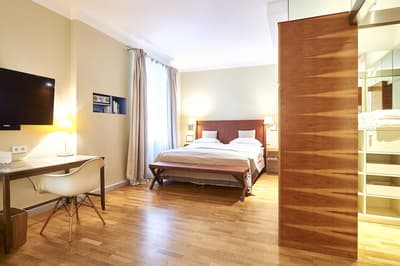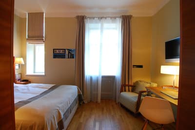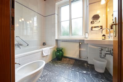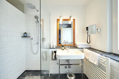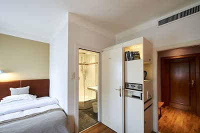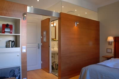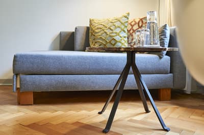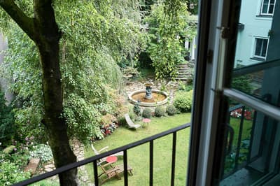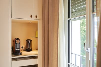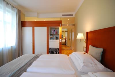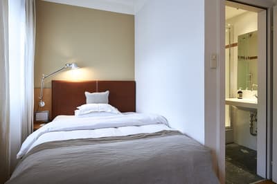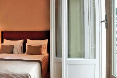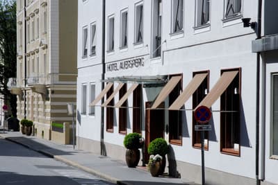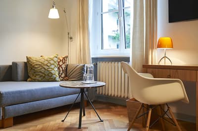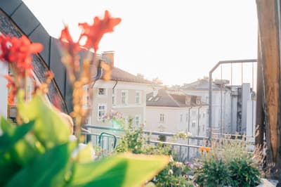 Envie d’un city-break sans les inconvénients du centre-ville ? Suivez le guide ! L’Auersperg est situé au calme, dans le quartier résidentiel d’Andräviertel, à 15 minutes à pied du centre historique. Il réunit deux maisons de ville adjacentes, construites à la fin du 19e. Mais ne vous fiez pas à la façade ultra-lisse : à l’intérieur, tout a été pensé avec un goût super raffiné. Sols en marbre et meubles anciens voisinent avec des pièces de créateurs contemporains. Dès l’arrivée, vous avez l’impression de vous balader dans les pages d’un magazine. La réception affiche un luxe discret : meubles d’époque, sièges vintage et luminaires stylés. Et vous êtes accueilli avec un welcome drink. L’occasion de découvrir le bar-lounge ! Très cosy, celui-là, avec son comptoir en bois et ses banquettes couvertes de coussins colorés. Dans le prolongement, la salle du petit déjeuner est hyper lumineuse avec ses baies vitrées. Pas de vrai resto ici, mais vous pouvez grignoter au bar toute la journée. Et du café aux cocktails, tout est plus bio que bio. La maison a fait le choix de produits naturels, équitables et de saison. Comme le miel du petit déjeuner qui provient des ruches du jardin — un endroit idyllique à la belle saison avec ses parterres arborés, sa jolie fontaine et sa terrasse aménagée. Last but not least : un petit spa en rooftop avec solarium, hammam et sauna. Ambiance tamisée, musique zen et massages avec vue sur la ville et la montagne au-delà !