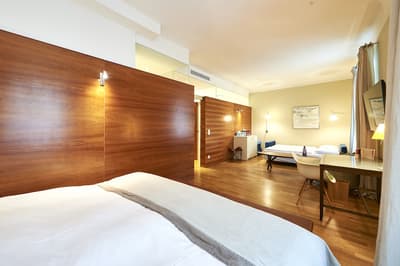 Dans un style résolument moderne, elle arbore un parquet en bois clair, un mobilier tendance et se complète dans des tons doux. La chambre est dotée d’un lit de 180 cm et la salle de bains est équipée d’une douche ou d’une baignoire. Le tout dans une atmosphère zen !