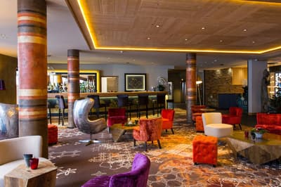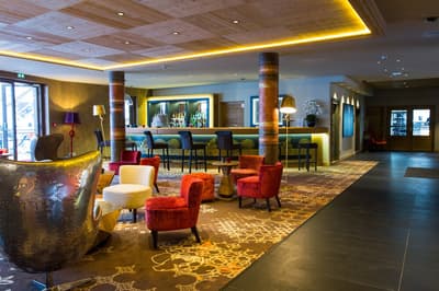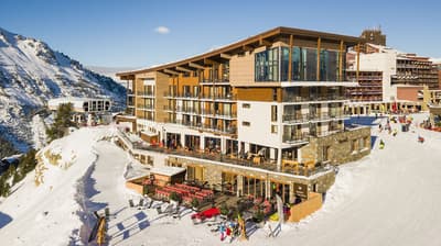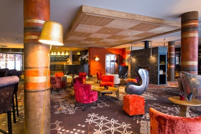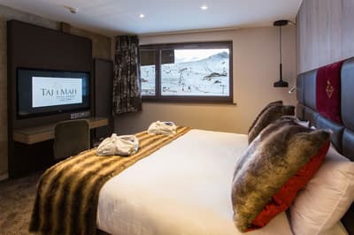 Bienvenue au Taj-I Mah, l’unique hôtel 5 étoiles des Arcs ! Au menu de ce petit bijou de luxe posé au pied des pistes de l’Arc 2000 : raffinement, régalade et réconfort. Et ça commence dès la prise de possession de votre chambre, conçue dans l’esprit d’un chalet savoyard de luxe. Fausses peaux de bête, matières nobles, jeux de lumière tout doux, et surtout les pistes derrière la grande baie vitrée ! Vous ne pouvez clairement pas être plus près… Enfilez vos skis, vous pouvez directement accéder aux télécabines. Et le soir, c’est une ambiance ultra-chaleureuse qui vous attend. Assez originale, en plus, avec cette petite influence indienne et même tibétaine au bistro ! Faites d’abord un petit tour ressourçant et relaxant au spa de 400 m2 avec sa piscine divine, son sauna et son hammam. Vous avez même un mur de sel de l’Himalaya pour vous recharger en bonnes ondes. Des bonnes vibes, on n'en manque pas non plus au bar lounge, où on se laisse volontiers séduire par une création de cocktails avant de passer à table. Au choix : aventure bistronomique haut de gamme ou cuisine plutôt brasserie avec une cuisson au feu de bois. Tellement réconfortant, tout ça ! Le spot est top pour une escapade en amoureux, clairement romantique dans l’esprit. Mais l’établissement est totalement adapté et pensé pour les petits aussi, alors ne vous privez pas si vous êtes en famille !