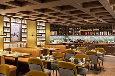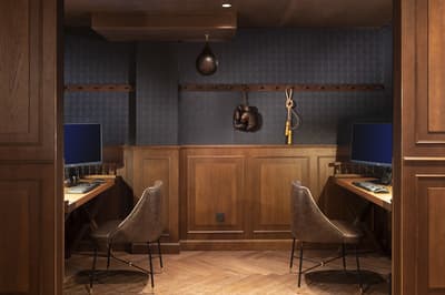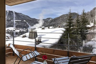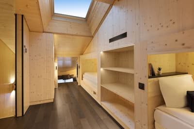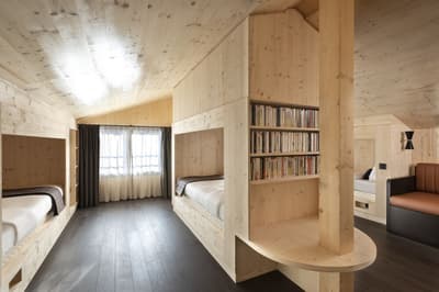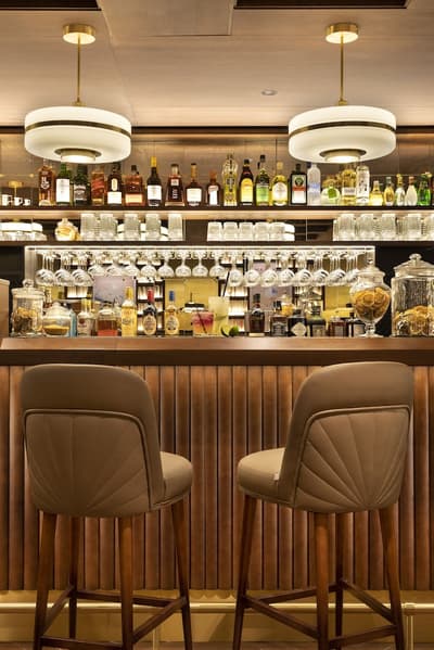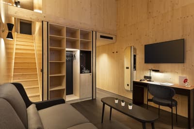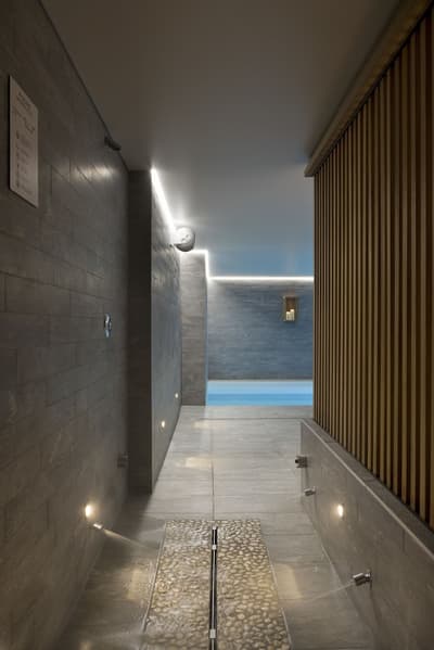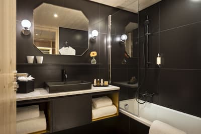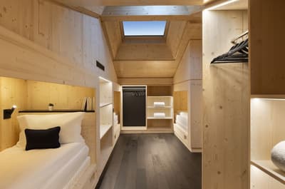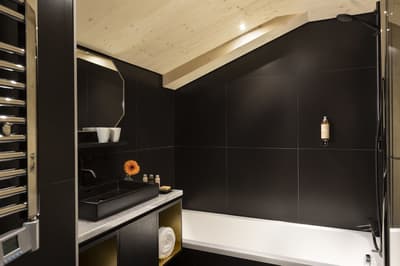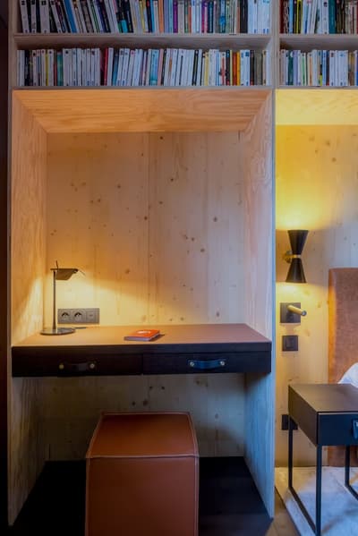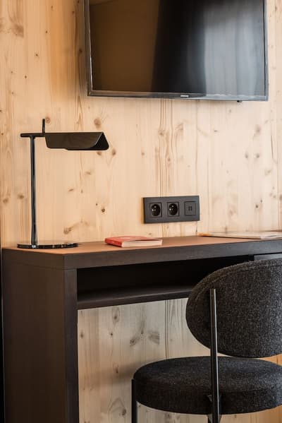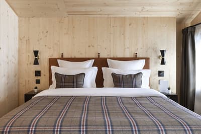 On le voit bien qu’il est récent ce chalet. Pour autant, quelle aisance pour se glisser dans l’architecture de La Clusaz ! Vous le trouverez en cœur de station. Entièrement en bois – hormis les fondations ! – il intrigue par sa mixité de modernité et de tradition. L’entrée ? Un tapis rond, en marbre de Carrare incrusté de laiton. Des lampes et un téléphone rétro sur le long comptoir, il y a comme un air de famille avec le film The Grand Budapest à la réception ! La talentueuse architecte d’intérieur Leslie Gauthier imprime dans chaque coin sa patte élégante et distrayante. A commencer par l’honesty bar, son dada. Filez donc au salon-bar, juste à côté ! Une atmosphère Art déco tout en géométrie invariable, avec ses banquettes crissantes de cuir et ses tabourets de bar au garde-à-vous. Un chic anglais, aussi, avec son mur de verre teinté entièrement rétro-éclairé. Un autre mur tapissé de livres, égayé de pubs Sixties : un rendez-vous confidentiel qui s’anime les soirs de concerts live ! Et dans les chambres ? Des murs en épicéa bien clair, du cuir camel pour tête de lits, du laiton côté luminaire... Autant de belles matières pour une note scandinave toute en légèreté. Et ce carrelage noir dans les salles de bains, clin d’œil aux lauzes savoyardes ! Descendez sous la réception... Non, pas au ski-shop – vous vous lâcherez après ! – mais dans ce spa signé Nuxe. Une réception bien feutrée et ces touches de vert embrun, comme pour mieux annoncer l’espace piscine épuré. Votre soin, en solo ou en duo ?