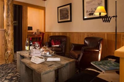 Arrivés aux 2 Alpes, traversez toute la station vers le télécabine de Vénosc. Arrêtez-vous devant ce pimpant chalet. Plus de 140 ans que la famille Mounier s’inscrit dans une lignée d’hôteliers. Il est loin le refuge avec ses 2 chambres ! 43 aujourd’hui, certaines avec balcon, ou même avec terrasse. Entrez vite ! C'est habillé de bois, à l’extérieur comme à l’intérieur, pas d’overdose pourtant, juste l’envie de s’y installer. Des sourires, une belle jovialité, voulez-vous visiter ? Vous repèrerez vite les deux parties : une pour les restaurants et le bar, des salons et quelques suites, et l’autre pour la nuit : 18 m2 pour un nid douillet, 80 m2 pour un duplex en tribu. Le choix est large, la déco diversifiée, mais tous les codes de la montagne sont là, en version modernisée : des peaux de bêtes en tapis, de drôles de tabourets, et du pin à l’envi du parquet au plafond. Malheureux ! Avez-vous pensé à réserver au P’tit Polyte, le restaurant étoilé ? Entre velours rouge et photos noir et blanc, concentrez-vous sur les saveurs d’une inventivité à gravir des sommets ! Pour le quotidien, c’est la salle d’à-côté et son roboratif petit déjeuner. 2 chefs pour un vrai succès. Et l’été alors ? C’est sur la terrasse au jardin, près de la piscine et face au massif des Ecrins. Même la vue est juste parfaite.