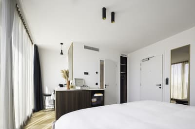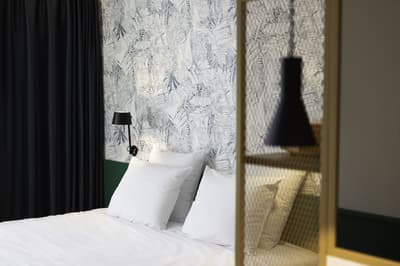 Pas hyper fan du style tradi, vous aimez mieux les endroits branchés ? Alors Yalo Urban Boutique Hôtel Gent est une adresse à noter dans votre petit calepin si vous cherchez un pied à terre sympa pour une escapade en Belgique. Ouvert en 2021, cet hôtel branché et design se situe dans le centre-ville de Gand, à l’ouest du Plat Pays. Notez qu’il est pour l’heure le seul à posséder un rooftop dans ce coin de la ville. On est pas bien là, à siroter un cocktail lové dans un fauteuil moelleux en admirant le paysage urbain qui se dessine tout autour ? En parlant de moelleux, sachez qu’ici il n’y a que des lits king size et une literie haut de gamme largement validés par les voyageurs. On apprécie aussi le soin apporté à la déco des chambres : élégant parquet en bois, murs blancs avec des boiseries d’un vert-bleu profond, étagères et mobilier minimaliste avec de belles couleurs sombres, tapisserie à motif façon Art déco… C’est chic et cosy à la fois. N’hésitez pas à allumer le tourne-disque ou la radio USB vintage et à faire péter la playlist conçue par Yalo, histoire de vous mettre dans l’ambiance. Les espaces intérieurs aussi ont été conçus avec soin dans cet esprit moderne et branché. Vous apprécierez sans doute le bar central au rez-de-chaussée, avec son design poussé et ses belles plantes, surplombé d’une grande verrière. C’est là qu’on s’attable pour le petit déj', composé essentiellement de produits frais et locaux. Labelisé Green Globe, Yalo utilise également des produits de nettoyage biodégradables ainsi que des produits d’hygiène à base de végétaux.