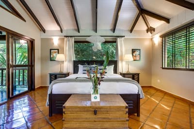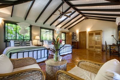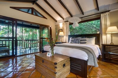 Élégamment conçue, elle comprend un beau carrelage, un mobilier confortable et se complète par des luminaires design. La chambre est dotée d’un lit king-size et d’un lit de repos et la salle de bains spacieuse est équipée d’une douche à l'italienne privée offrant une vue sur la jungle du sol au plafond. Elle dispose également d’un coin salon pour vous détendre et recevoir vos invités. Le tout dans une ambiance tropicale !