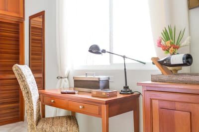 C’est un cadre idyllique ! Elle trouve un juste milieu entre l’intérieur et l’extérieur. Ses grands panneaux vitrés laissent pénétrer la lumière naturelle pour s’harmoniser avec la nature environnante. La décoration est moderne mais tout de même exotique avec les touches de bois et de rotins. Des touches de couleurs vives complètent l’ensemble.