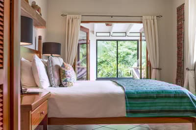 Installée parmi la végétation luxuriante du jardin, c’est un petit cocon baignant dans une atmosphère sereine. La terrasse est aménagée de longues chaises. Elle accommode un ou deux lits queen. Salle de bain avec baignoire et douche extérieure.