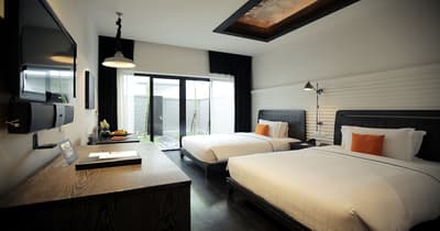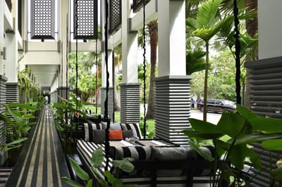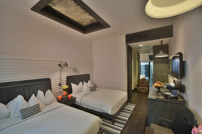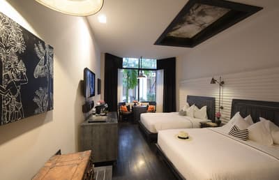 Un petit hôtel de charme aux allures de temple à deux pas d’Angkor Vat ! Le Shinta Mani Angkor joue sur le contraste entre les vieilles pierres, partout présentes dans la région, et le design contemporain qui habille ses murs. Il fait face à son jumeau, le Shinta Mani Shack, avec lequel il partage équipements et prestations. Ses chambres élégantes sont bien décorées, entre photos contemporaines et œuvres d’art khmères. Couloirs en béton ciré, mobilier sombre, salles de bains immaculées : ici, le noir et blanc est un parti-pris fort, qui fait toute la personnalité du resort et son charme excentrique. Seuls les coussins posés sur les lits et l’éclairage classe amènent quelques touches de couleur éclatantes. Côté table, c’est l’embarras du choix. Dans l’un des restos des hôtels frères, vous vous régalerez de succulentes viandes, de plats du monde ou de cuisine khmère, de rue ou gastronomique. Mais Shinta Mani, c’est aussi une fondation, très engagée envers les communautés locales, qu’elle aide pour la construction de maisons, de puits, de toilettes… Une fondation qui a aussi initié une ferme expérimentale et une école de restauration et d’hôtellerie, dont sortent certaines des personnes qui vous servent ici ! Inhabituel et réjouissant sinon : le Shinta Mani propose une véritable carte d’activités pour explorer la région : à pied, en tuk-tuk, en bateau, à l’arrière d’un scooter… et même en char à bœufs ! L’occasion de visiter les marchés anciens, les communautés flottantes ou les montagnes environnantes… et bien sûr le temple d’Angkor Vat, trésor inestimable classé par l’UNESCO. Le plus grand monument religieux du monde, si célèbre qu’il orne le drapeau national cambodgien ! Après les émotions de sa visite, le Shinta Mani Angkor sera l’endroit idéal pour reprendre souffle…