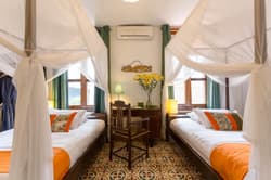 Pincez-vous ! Le Pavilion Hotel n'est autre que l'ancienne résidence privée de la reine consort Kossamak, mère du feu roi Sihanouk. Si vous n'êtes pas calés en histoire cambodgienne, - nous non plus ! -, retenez seulement qu'il s'agit d'une merveilleuse propriété des années 1920 ! L'architecture khmère fut ici revisitée par les codes stylistiques français, du fait du Protectorat de l'époque, avec ces décrochements de façades, ces terrasses et ces balustrades. Le tout, immergé dans une flore exubérante, est incroyablement séduisant. Vos yeux seront tantôt happés par ces palmiers extraordinaires qui semblent faire la révérence au-dessus de la "Lush Pool," tantôt fascinés par ces statues en pierre figurant des lions, des dragons ou encore des éléphants qui gardent les portes ou décorent le jardin. Il y a des vasques en faïence dont le bleu hypnotique rappelle celui des piscines. Les parasols sont à l'image de ces ombrelles avec lesquelles on tope les cocktails. A l'intérieur, les parties communes parlent de faste. Ces colonnes élancées, ces parterres de mosaïque et ce mobilier colonial en bois sombre vous laisseront bouche bée... Une adresse adults only.