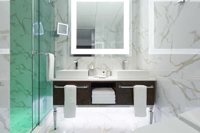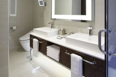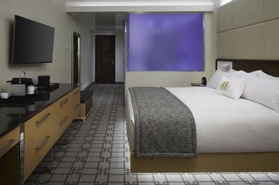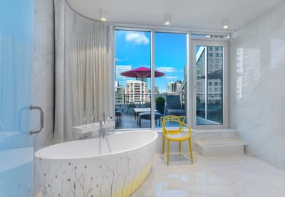 Le top ! De sa grande baie vitrée, elle profite d’une vue reposante et sereine sur la ville vibrante. Cette belle suite est d’un confort absolu. Idéale pour un couple, elle accommode un grand lit king et dispose d’un coin salon complètement meublé. Salle de bain avec douche à effet de pluie.