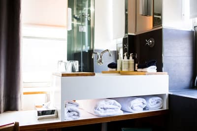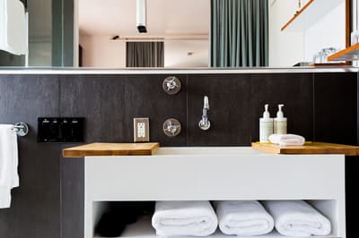 Cosy et minimaliste, elle baigne dans un style quelque peu rustique. Grâce à ses murs et son carrelage de couleur clairs, elle est lumineuse et accueillante. Le mélange de bois et de rotin lui donne une touche exotique. Quelques touches de couleurs y ajoutent du peps.