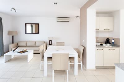 Conçue pour accommoder toute une famille, elle est spacieuse. Elle dispose d’un lit double et de 2 lits simples. Le balcon est aménagé de belles chaises pour apprécier la vue apaisante sur la piscine. Salon meublé de fauteuils confortables. 2 salles de bains chics.