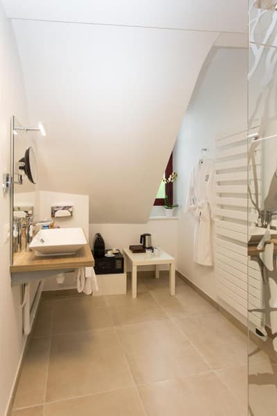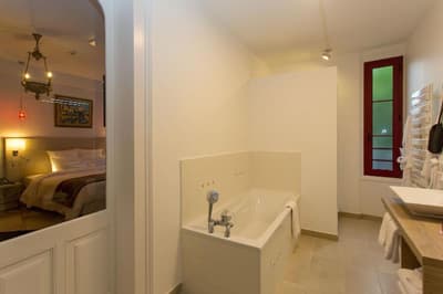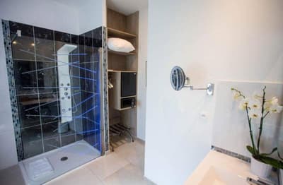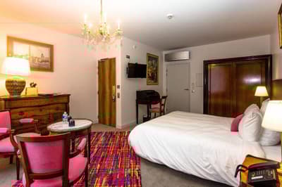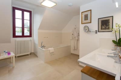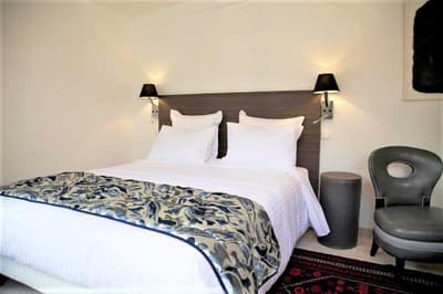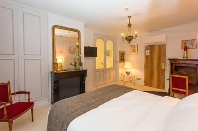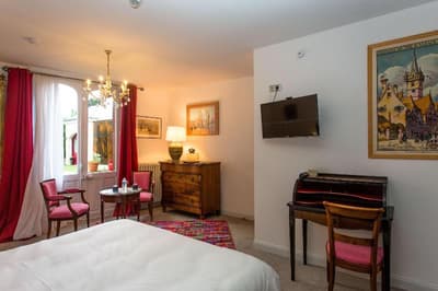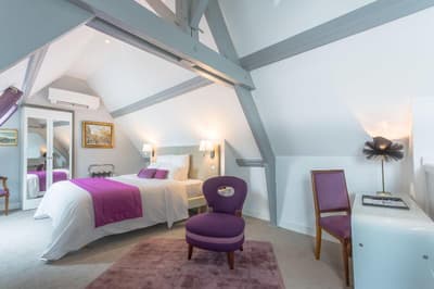 Rabelais, originaire de Touraine, a sa rue dans le centre-ville d’Amboise. Vous vous y engagez facilement, d’autant qu’elle est à sens unique. La façade du numéro 25 est classique, un grand porche arrondi, trois grandes lucarnes en ardoises et des volets rouge-brun qu’on ne peut pas louper. Pour en saisir le fameux charme, poussez la porte et admirez le majestueux hall au dallage blanc à cabochons noirs, avec ses vitraux aux portes, ses orchidées et ses meubles laqués. Puis passez côté jardin. Et là, ils claquent vraiment les colombages de cette maison de maître du XVIIIe siècle. D’ailleurs l’aile moderne qui abrite l’espace détente avec bain à remous et sauna ne choque absolument pas. Maintenant retournez-vous, passez les quelques arbres et gagnez le fond du terrain. Et oui, c’est bien une piscine extérieure chauffée devant un discret et récent bâtiment d’habitation. Richard et Sylvie ont commencé par ouvrir des chambres d’hôtes dans leur grande demeure. L’engouement des clients aidant, ils l’ont transformée en charmant boutique-hôtel de 10 chambres. Une capacité doublée mais toujours cette même hospitalité qui vous fera vous sentir chez vous. Et, cherry on the cake, depuis votre chambre à l’ambiance feutrée, vous apercevrez peut-être le château !