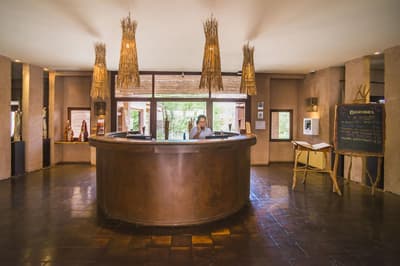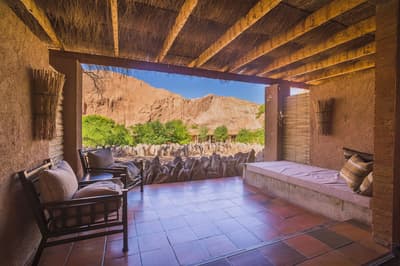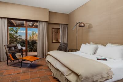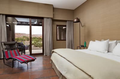 Cette magnifique chambre s’ouvre sur une grande terrasse aménagée d’où vous pourrez contempler la vue imprenable sur les jardins intérieurs du lodge, la vallée de catarpe ou la sierra de sel. Lumineuse, le soleil du désert est filtré par le toit profond offrant à la chambre une température idéale, du réveil jusqu'au coucher. À noter qu'elle est située à quelques pas du restaurant et du spa et qu’une chambre accessible aux personnes à mobilité réduite est disponible.