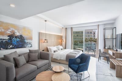 Un balcon dans chaque chambre ! Et pas n’importe lequel, un balcon en verre s’il vous plaît. Vous savez ce que ça veut dire ? Déjà, vous pouvez prendre la chambre la moins chère qu’elle sera sûrement meilleure que les plus chères dans d'autres hôtels. Et surtout, vous pourrez vous détendre à l’air libre du matin au soir ! Allez, prenez donc cette vue sur la mer dont vous rêvez ! Mais le plus important dans tout ça, c’est que les chambres suivent cette qualité avec des meubles design, de l’art moderne et une déco stylée. Et ce n’est rien à côté du reste… Le lobby est juste grandiose avec son sol en marbre, ses immenses cadres d’art et ses murs en bois lumineux. Mais bon, ce n'est pas là que vous allez passer vos vacances. Ce qui vous intéresse, c’est la piscine, n’est-ce pas ? Regardez donc ces transats très, très classe. Nul doute que vous y resterez des heures durant… Et vous savez quoi ? Ce n'est pas grave ! Essayez quand même d’alterner entre le transat et le pool bar pour avoir l’impression de bouger un peu. Et puisque vous êtes à Protaras, vous aurez la plage au bout de la rue, mais aussi une quantité innombrable de boutiques et restaurants. A tel point que vous ne saurez plus où donner de la tête. Nous serons là pour vous rattraper, promis !