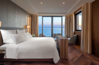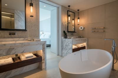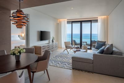 Dans un style de décoration contemporaine, elle arbore un parquet en marbre ou en chêne européen et se complète dans une palette de couleurs de bleu poudre, de vert et de blanc cassé pour la sérénité. La chambre est dotée d’un lit king-size ou lits jumeaux avec tables d'appoint inspirées du bois flotté. La grande salle de bains privative en marbre est équipée d'un double lavabo, d'une grande baignoire et d'une douche indépendante. Le tout dans une ambiance détendue !