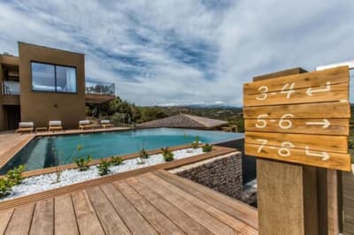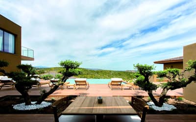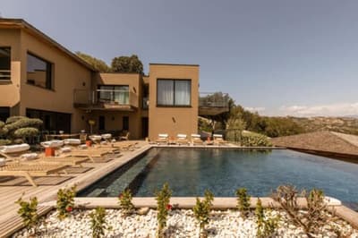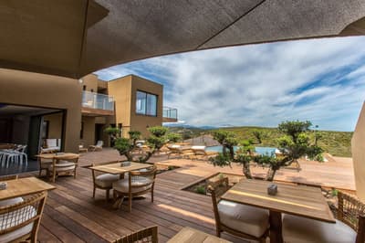 Tous les matins du monde. C’est la douce partition que joue sans répit ce boutique-hôtel perché en plein maquis sur les hauteurs du golfe de Santa Manza. Vous êtes un lève-tôt ? Veinard ! Vous aurez le privilège d’assister au spectacle éblouissant du soleil levant, venu dissiper tout en douceur les bribes de la nuit... Et éclairer l’architecture cubique atypique de cet établissement intégré dans son environnement, qui ne compte que 10 chambres et une suite logée dans une ancienne bergerie : un cadre étonnant qui reprend le confort des chambres à la déco contemporaine super bien pensée, entre espace et lumière. Pour bien commencer la journée, vous respirez à plein nez les essences du maquis depuis votre terrasse privée. Puis vous vous immergez dans le bleu de la piscine à débordement et vous plongez votre regard dans le vert autour. Avant de vous attabler pour un copieux et goûteux petit déj' aux saveurs locales. Sur la terrasse de préférence, pour ne rien manquer de cette vue incroyable sur la nature, avec au loin le bleu du golfe. Comme un signe vous invitant à découvrir la plage sauvage et préservée en contrebas, que vous rejoindrez en buggy ou, soyons fous, à VTT. Et si jamais l’effervescence urbaine vous manque, direction Bonifacio, ses trésors patrimoniaux, ses ruelles, son port, ses falaises et son ambiance unique de cité corse !