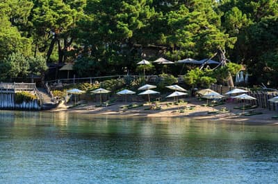 Un bel hôtel niché au bord du golfe de Porto Vecchio, avec plage privée et sublimes terrasses au milieu de la pinède.