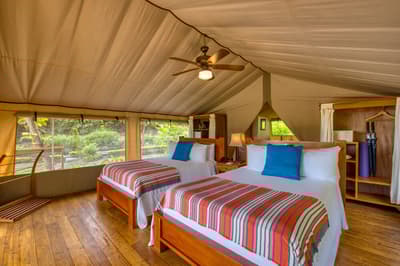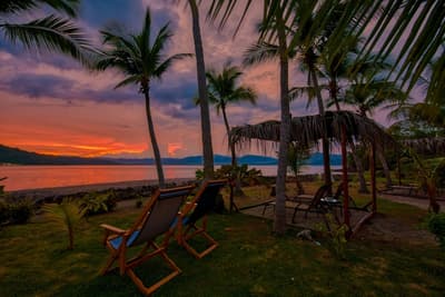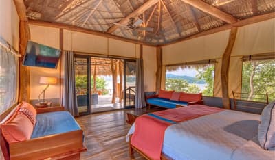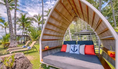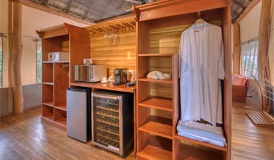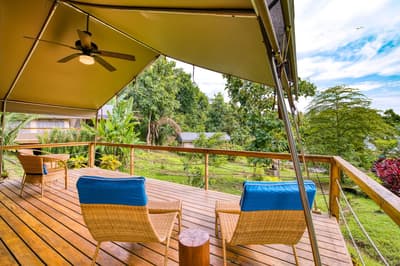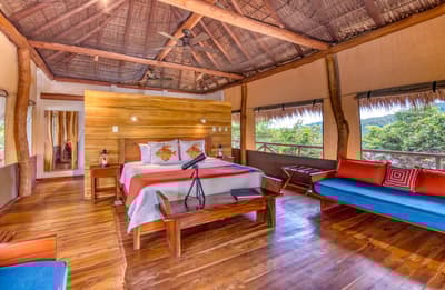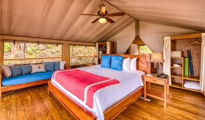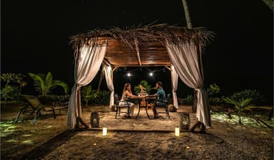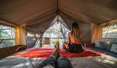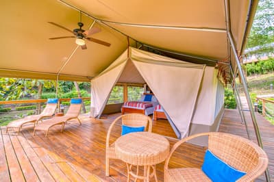 Une belle adresse est souvent accompagnée d’une belle histoire. Ici, on se balade à mi-chemin entre la Carte au Trésor de R.L Stevenson et Coachella. A la place des pirates, on imagine des digital nomads ou des couples en goguette. Les jus detox ont remplacé les choppes de rhum, mais l’impression reste celle d’une île vierge, qui ne demande qu’à exhiber ses trésors, farouchement gardés par des hordes de singes hurleurs... Paraît-il que la première fois que le fondateur d’Isla Chiquita a mis les pieds sur son île en solitaire, il a ressenti le besoin immédiat de courir « pieds nus sur le sable de sa plage et cheveux à l’air », pour se sentir pleinement connecté à l’île. Si l’histoire semble tout droit sortie de l'imagination d'un copywriter, on a vraiment envie d'y croire ! Jadis, les pêcheurs se retrouvaient ici après leurs aventures maritimes pour échanger des conseils et se marrer au coin du feu. C’est cette ambiance bon enfant, décontractée et totalement coupée du monde, qu’on retrouve encore aujourd’hui. Inaugurée en 2017, voilà la toute première adresse glamping du Costa Rica ! Et ce style d’hôtellerie ancré dans l’air du temps est parfaitement adapté à une destination aussi eco-friendly. 4 ans après l'ouverture, les 18 tentes de l’hôtel sont fermement ancrées dans leur minuscule îlot, toisant fièrement du regard le Golfe de Nicoya qui s’étend en contrebas.