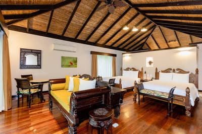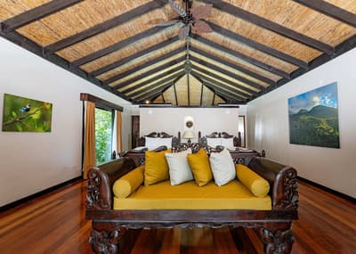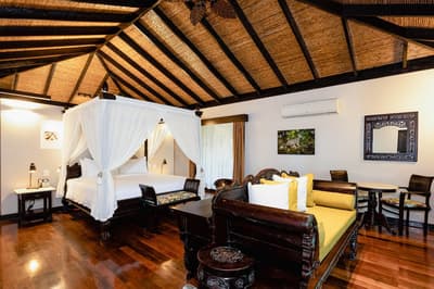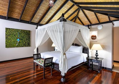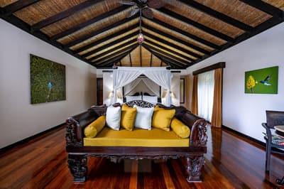 Dans une décoration chic et raffiné, elle arbore un beau parquet ciré, un mobilier en bois sculpté et se complète dans une dominance de blanc. La chambre est dotée d’un lit king-size ou de deux lits queen-size, équipés de draps luxueux et la salle de bains dispose de toutes les commodités nécessaires. Le tout dans une atmosphère tropicale !