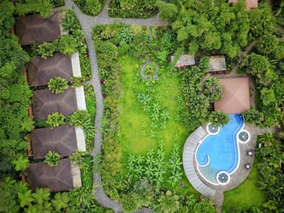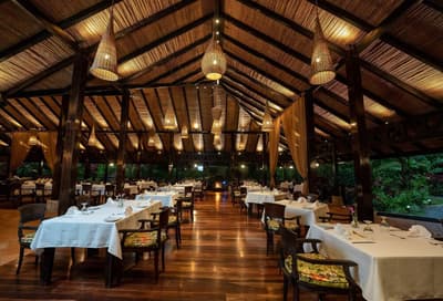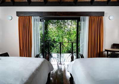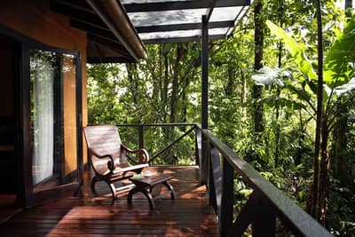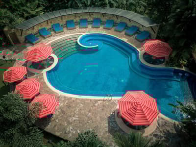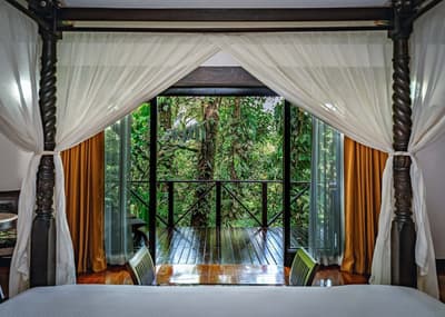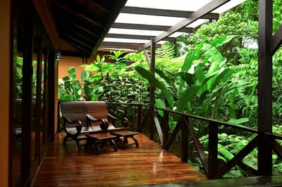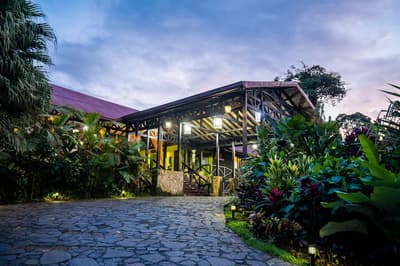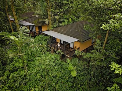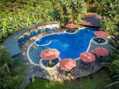 Attention, le site du Rio Celeste Hieaway Hotel est exceptionnel à plusieurs titres : les sentiers du domaine, longeant la rivière Celeste et traversant la réserve El Tapir, couvrent un périmètre d'environ 2,5 km, vous permettant ainsi 32 ha d'exploration ! Mais le grand luxe pour vous, sera surtout de vous baigner dans le rio ! Quant à l'hôtel, il n'est qu'à 5 min du parc. La propriété est la parfaite symbiose entre ce côté sauvage, pour ne pas dire virginal, qu'on s'attend tous à trouver au Costa Rica, et ce côté confort pourtant improbable au beau milieu de ce nulle part. Ne soyez pas surpris en tout cas si vous apercevez un coati piquant des fruits au bar ou buvant l'eau de la piscine ! Une jolie piscine paysagée d'ailleurs ! Et votre casita ? C'est un vrai concentré de charme, qui plus est spacieuse, y compris pour les familles. Les prestations concernant la restauration et le spa sont dignes des standards internationaux, avec le sourire et l'attention des Costariciens en plus. Vous profitez d'ailleurs du petit-déjeuner pour admirer les oiseaux qui viennent se nourrir sur les mangeoires qui leur sont réservés, aux abords de la salle de restaurant...