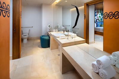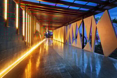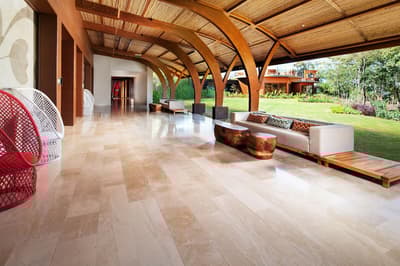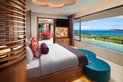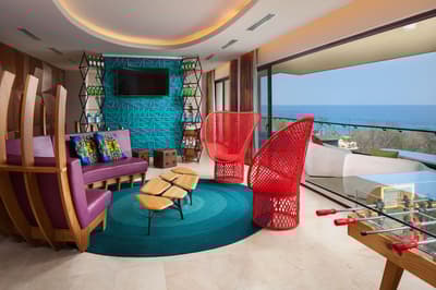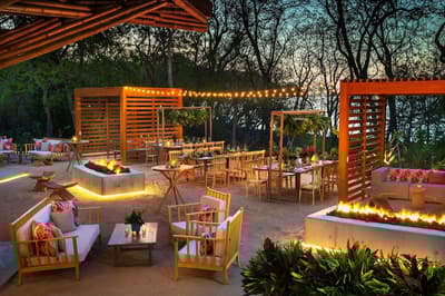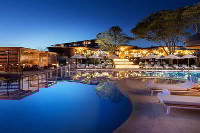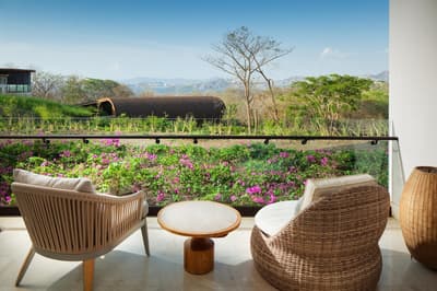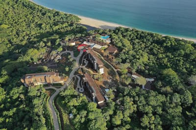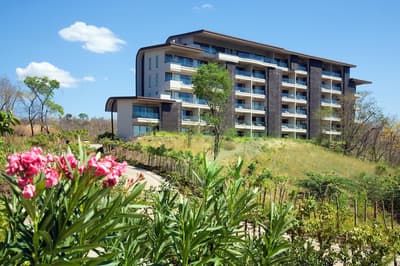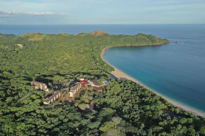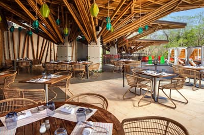 Si vous cherchez l'effet wow, vous êtes à la bonne adresse! Au bord d'une belle plage sauvage, au cœur d'une réserve protégée de 930 hectares, voilà un hôtel dont l'architecture va vous scotcher. Le hall d'entrée en panneaux de bois et pierre évoque l'intérieur d'un marimba. Le xylophone latino-américain et le lobby rappellent une forêt — avec un incroyable bar circulaire incrusté de 9000 bouteilles de bière recyclées, dont les couleurs rappellent les plumes de colibri ! On peut énumérer ainsi à l'infini : teintes vives du Wet Deck en clin d'œil aux chars à boeufs des paysans, cabines du spa façon chrysalides de papillons en hommage aux 1500 espèces locales, têtes de lits aux motifs floraux dans les 150 chambres et suites... On en oublierait presque de contempler le panorama sur la forêt tropicale sèche et l'océan Pacifique ! Pourtant, la nature est au bout des baskets : des sentiers sillonnent la réserve pour des balades à pied ou à vélo, pour tous. Et s'océan se prête parfaitement aux sports nautiques doux : SUP, kayak ou surf, dans un rayon de 25 à 45 minutes. En famille, on apprécie le club enfants et la piscine dédiée. Et en couple, les soirées au Beach Bar avec DJ, et les activités sportives : golf, tennis, fitness, cours d'aérobic, yoga ou soins au Spa.
