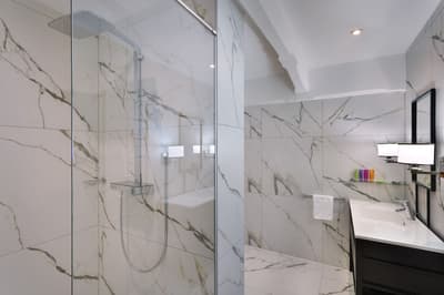 Confortable et élégante, elle comprend un mobilier design, un beau parquet, des accessoires tendances et se complète dans des tons doux. La chambre est dotée d’un lit douillet et la salle de bains en marbre est équipée d’une douche à l'italienne. Le tout dans une atmosphère relaxante !