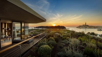 Situé sur la magnifique péninsule d’Istrie, entre une forêt de pins d’Alep et la mer Adriatique, le bâtiment futuriste du Grand Park Hotel Rovinj se fond complètement dans le décor ! Sur six étages, mais tout en longueur, épousant le relief avec ses jardins en terrasse — sur lequel donnent les balcons des chambres —, ce pied-à-terre est une véritable perle. Tout est spacieux, comme en témoignent la suite signature à 173 m² ou le hall d’accueil qui nous prend par surprise avec son panorama sur l’île Sainte-Catherine et la vieille ville de Rovinj. Verre, bois et plantes… L’architecture comme le design intérieur, très contemporains, permettent une immersion complète. Et si la déco semble neutre au premier abord, elle est rapidement égayée par la vue sur la nature — verte ou bleue, selon vos préférences ! Côté détente, tout y est. 1. Les employés aux petits soins. 2. Les piscines, au nombre de trois, soit avec une vue imprenable, soit propice à la relaxation, soit tout simplement idyllique. 3. Le spa, avec ses oasis de bien-être et ses rituels inspirés de la tradition. Ça, c’est notre top 3, mais il ne faut pas oublier le choix de restos et surtout le petit déjeuner, à prendre en terrasse of course et jusqu’à midi. De quoi ravir les amateurs de grasse mat’ !