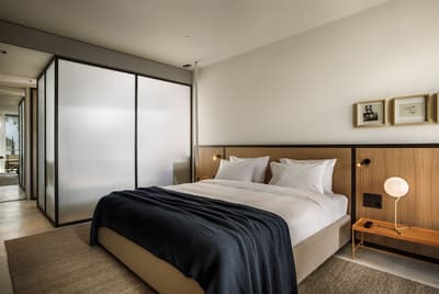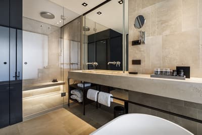 Dans un style qui peut être décrit comme un minimalisme confortable et un luxe exprimé à travers des matériaux naturels, elle arbore des tons de terre et se complète dans des matériaux naturels. La chambre est dotée d’un lit king size spacieux et la salle de bains est équipée d’une baignoire, douche à effet pluie, toilettes séparées et double vasque. Le tout dans une atmosphère cosy !