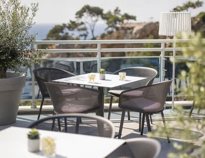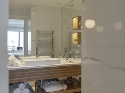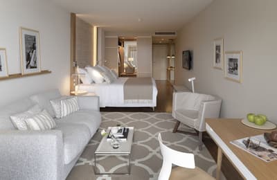 Cette magnifique suite exécutive offre un espace détente séparé ainsi qu’une vue exceptionnelle sur la mer que vous pourrez contempler du balcon meublé. À noter que 60€ de crédit chambre est à dépenser au Wine Bar.