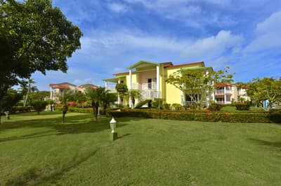 La chambre est peinte dans un joli jaune custard et comprend de beaux rideaux assortis, un lit king size ou deux lits individuels et un mobilier également jaune custard. La salle de bain est bien équipée et comporte une baignoire. Le tout dans une ambiance tropicale et relaxante !