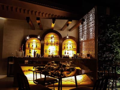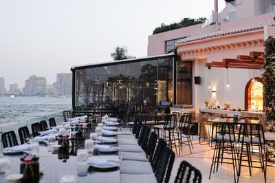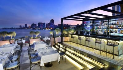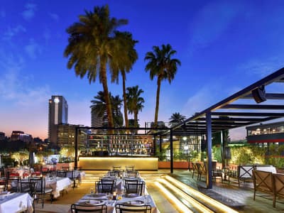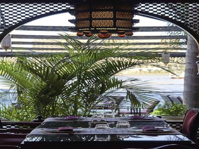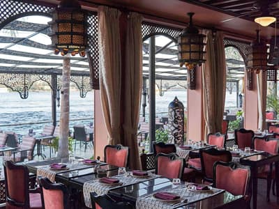 Séjourner sur une île, au beau milieu du Caire ? Oui, c'est possible ! Le Sofitel Cairo Nile El Gezirah se trouve sur la pointe sud de l'île de Gezirah, à Zamalek, le quartier chic de la capitale. De l'extérieur, il ressemble à un gros cigare rose, émergeant de nulle part ! Bref, on ne voit que lui ! Passé cet effet surprenant et insolite, le charme opère. Dès l'entrée dans le hall d'accueil, vous êtes tour à tour hâpé par ce lustre à pampilles géant, ce superbe plafond en bois ornemental, cet escalier en saillie façon art déco comme si vous étiez à Miami Beach, et enfin par cette grande baie vitrée derrière laquelle des palmiers vous donnent rendez-vous avec le soleil. Sculptures d'éléphants en ébène et bouquets de lotus achèvent de parfaire le dépaysement ! Une autre baie sépare à peine la piscine intérieure de la piscine extérieure. Cette dernière, avec son deck qui court au-dessus du Nil, est absolument fabuleuse ! L'enfilade de terrasses des restos de l'hôtel est la bonne surprise du site, vous permettant de longer le fleuve via une promenade aménagée entre les tables et le bâtiment, sans même avoir à sortir du périmètre. En parlant de Deck, celui made "by Laurent Peugeot" est un piège à esthètes, doublé d'un piège à gourmets ! Design, branché, classe - dress code oblige ! -, à la fois bar et restaurant, il offre une vue terrible sur le Caire illuminé...