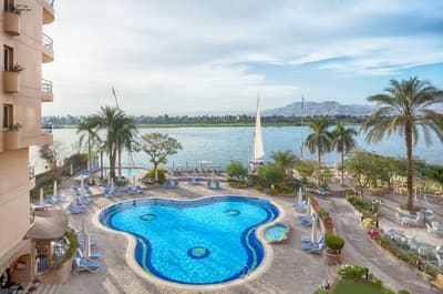 S’il n’y avait qu’une raison de choisir cet hôtel, c’est très certainement pour son panorama à couper le souffle ! Il vous en reste un peu ? Ici, pas de tour Jean Nouvel pour vous gâcher la vue, les berges du Nil sont totalement dégagées. À l’horizon, on mate les montagnes où se reposent pépères pour l’éternité pharaons and co. Les lève-tôt vont pouvoir s’éclater à compter les montgolfières qui s’élancent chaque matin dans le ciel. Ici, on ne compte pas les moutons : une montgolfière, deux montgolfières, trois montgolfières… Et les couchers de soleil ! Des couleurs que même les daltoniens réussiront à percevoir. Un peu plus et il y avait risque de décollement de la rétine. Cet hôtel est un peu à l’écart du centre historique de la ville. Un défaut ? Non plutôt une qualité quand on sait à quel point la dense circulation égyptienne peut parfois taper sur les nerfs ! Côté design extérieur, ceux qui aiment l’authenticité locale vont adorer ! Malgré une façade jaune orangée pas forcément au summum de l’esthétique moderne -mais les Egyptiens, eux adorent !-, il cache quelques pépites en terme de chambres et de restauration. Classe affaire, vue sur ville ou sur le patio, panoramique avec vue sur le Nil, en solo jusqu'à 4 personnes... Il n'y a que l'embarras du choix. Le tout décoré, sur ce coup-là, avec beaucoup de simplicité moderne ! Les tribus plus importantes apprécieront, sur-demande, des chambres communiquant par le balcon.
