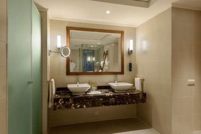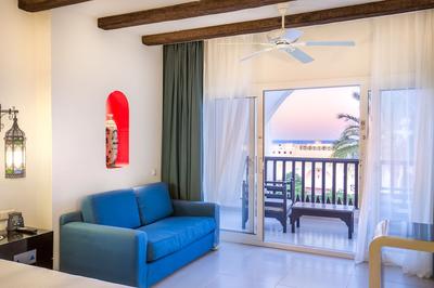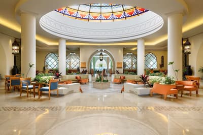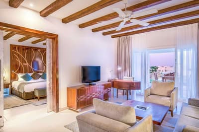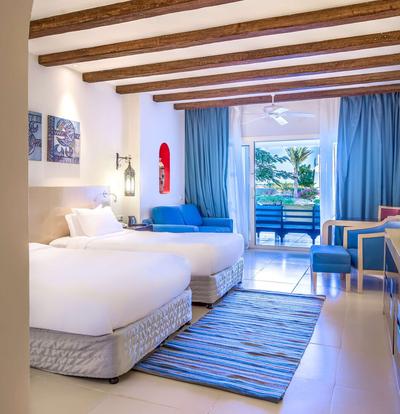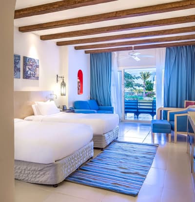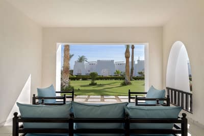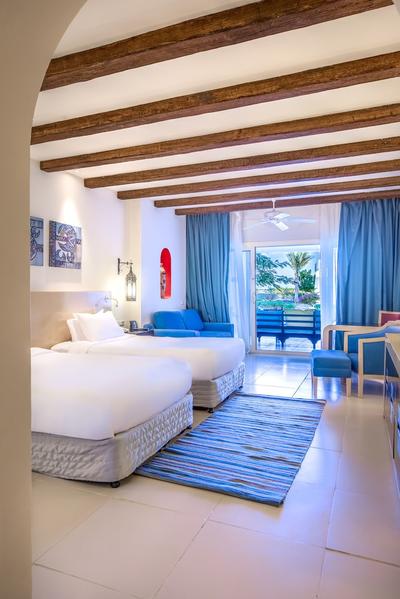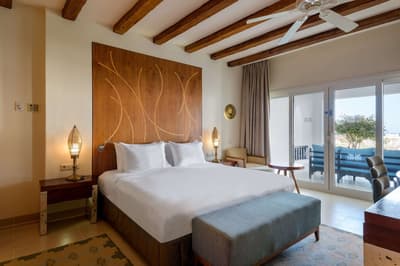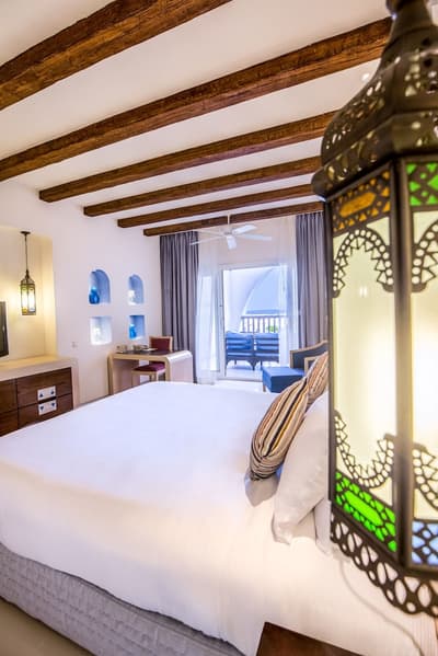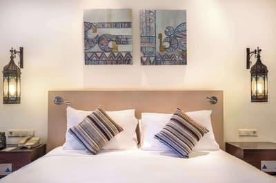 Le bonheur, les pieds dans l'eau... ou presque. Hilton Marsa Alam Nubian Resort 5* jouit de tout ce que l'une des plus belles baies de la Mer Rouge peut lui offrir. Des kilomètres de sable blanc, une eau turquoise et un récif de coraux abritant les espèces aquatiques les plus insolites. Ça en deviendrait presque lassant toute cette splendeur... L'architecture de l'hôtel a de quoi surprendre. On est loin des mastondontes qui pointent vers le ciel des grandes villes d'Égypte. Et pourtant la démesure n'est pas loin. Vous allez entretenir votre cardio-fitness grâce aux pas quotidiens que vous ferez, notamment pour aller vous prélasser sur la plage privée. Vous ne voulez pas marcher ? C'est bien simple, un petit train vous y emmène. Il suffit de demander ! Sur un domaine hyper étendu entouré de dunes toutes plus hautes les unes que les autres, 400 chambres réparties sur 23 bâtiments lui donnent réellement des allures d'irréductible village gaulois mais dans un seul registre de couleur : le blanc. Sûrement en promo pendant le mois du blanc égyptien... Ici, tout est immaculé, de l'extérieur à l'intérieur, du sol au plafond. Dans les chambres, seuls quelques éléments de déco viennent perturber cette palette monochromatique minimaliste. Des poutres en bois précieux apparaissent au plafond. Les chiens - sauf ceux d'assistance - sont interdits mais quelques niches abritent des vases en verre. Des lanternes marocaines servent de points d’éclairage un peu partout. Rayures et motifs géométriques habillent discrètement les parures de lit et les murs - des oeuvres picturales très certainement signées d'un artiste local - et insufflent cette petite touche 100% nubienne. La sensation d'apaisement et de sérénité est totale. Que demander de plus ?