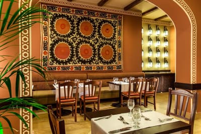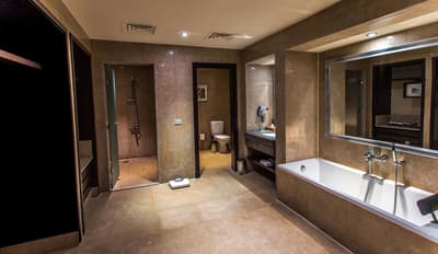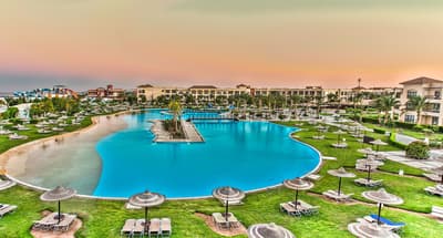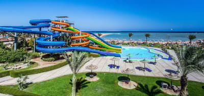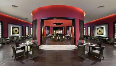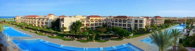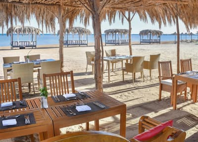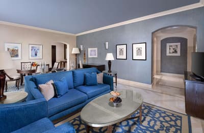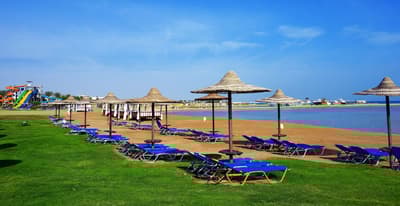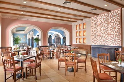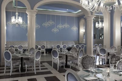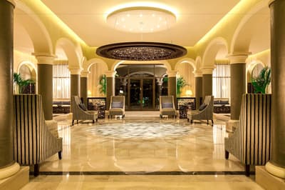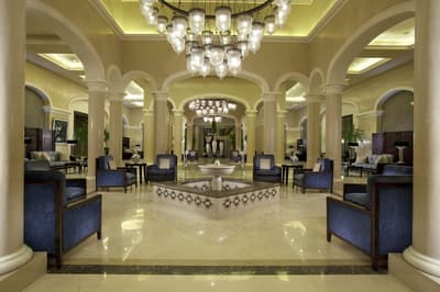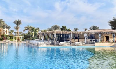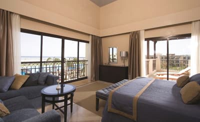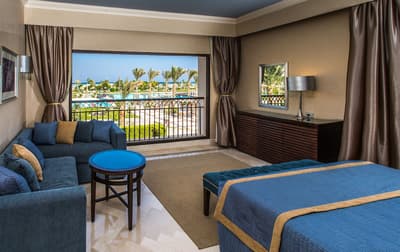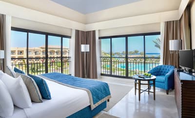 Ce complexe cinq étoiles porte bien son nom ! Jaz Aquamarine Resort a non seulement les pieds dans la mer Rouge mais ici, la couleur reine est le bleu. Vous allez rapidement être dans le bain. Attention, ce n’est plus une vaguelette de couleurs océan mais bien une déferlante de nuances qui submerge tous les recoins du resort. À faire pâlir de jalousie Toutânkhamon -qui doit se retourner dans son sarcophage- dont le masque funéraire n’a pas autant de lapis-lazuli et de turquoises incrustées… Besoin d’une bouée, peut-être ? En résumé, le bleu : des piscines, de la déco des chambres, des mosaïques du spa, des fauteuils du hall, des coussins du bar de la piscine et du Fayrouz Lobby Bar – qui obtient la palme, de plongée ? -. Il porte cette couleur de son sol en marbre jusqu’au plafond. L’atrium du hall d’accueil, quant à lui, va vous tenir en haleine ! Digne d’un roman des mille et une nuits, d’ailleurs le concept choisi par la chaîne, il ressemble en tout point à un palais de marbre avec colonnes, arcades, lustres monumentaux, puits de lumière et fontaine (de jouvence ?). Un vrai décor de péplum ! Dans ce resort, il y a 1001 chambres. Pas une de plus, pas une de moins ! Ce n'est, bien évidemment, pas un hasard…